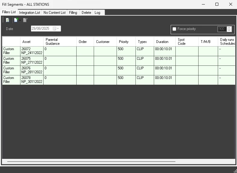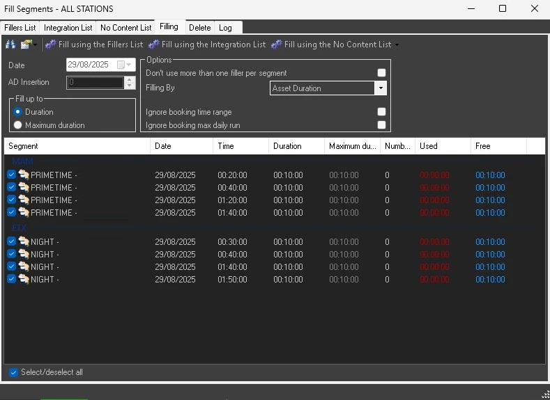 While Fill segments can use both assets from media library and assets linked to the contracts, the tool Fill segments - ALL STATIONS allows to add to the filler lists only assets from media library, as contracts are bound to a specific station and using those assets on a different one could cause accounting issues.