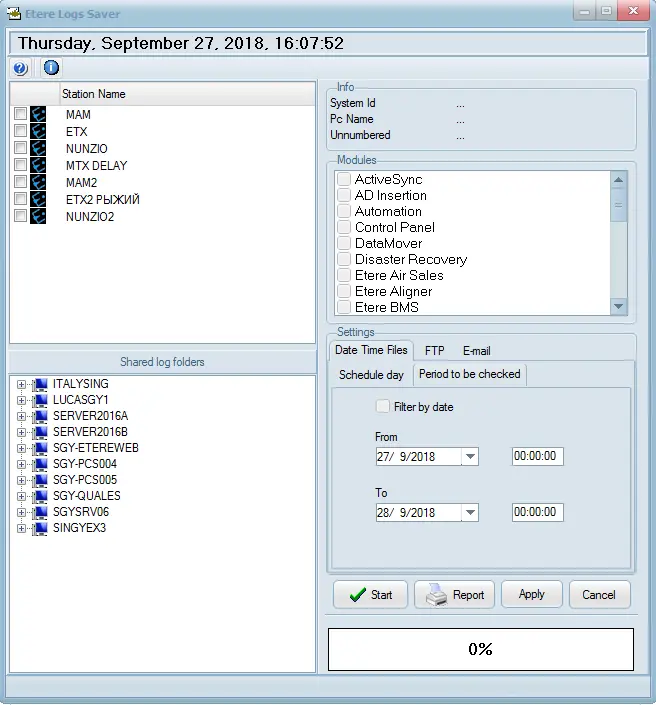Modules - List all the modules installed in at least one Etere workstation, allowing one to select the one(s) for which logs will be saved. For instance: