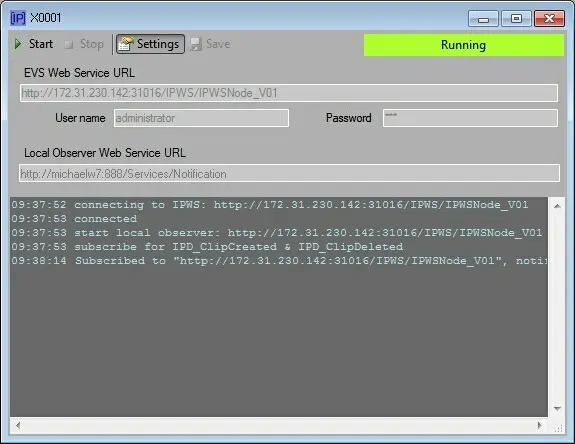 Once the [EVS_main_icon01 Start] button is pressed, the web service starts listening for notifications; every time a notification is received from the EVS IP Director, the EVS Integration Tools application performs one of the following procedures depending on the notification type and the main settings: