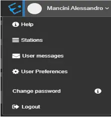 The Login User Menu is placed on the right side of the top bar and it can be opened clicking on the name of the currently connected user. Beside the user's name, there are its picture (it can be added in Personal data) and the icon of the station currently in use.