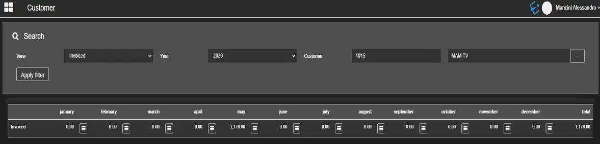 In the example above, the user filters all the contracts already invoiced for 2020 for customer ID 1015. This customer, in 2020, has been invoiced contracts only in May, with a total value of 1,176 Euros.