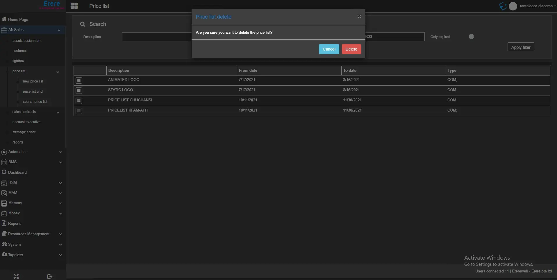 The Delete Function would allows the operators to easily remove the given Price List on the fly. A confirmation Message would eventually appears in order to confirm the given operation;