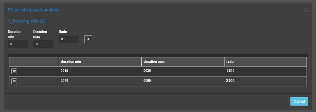 The conversion table allows defining the "price ratios" to be applied for specific duration intervals by the table shown below: