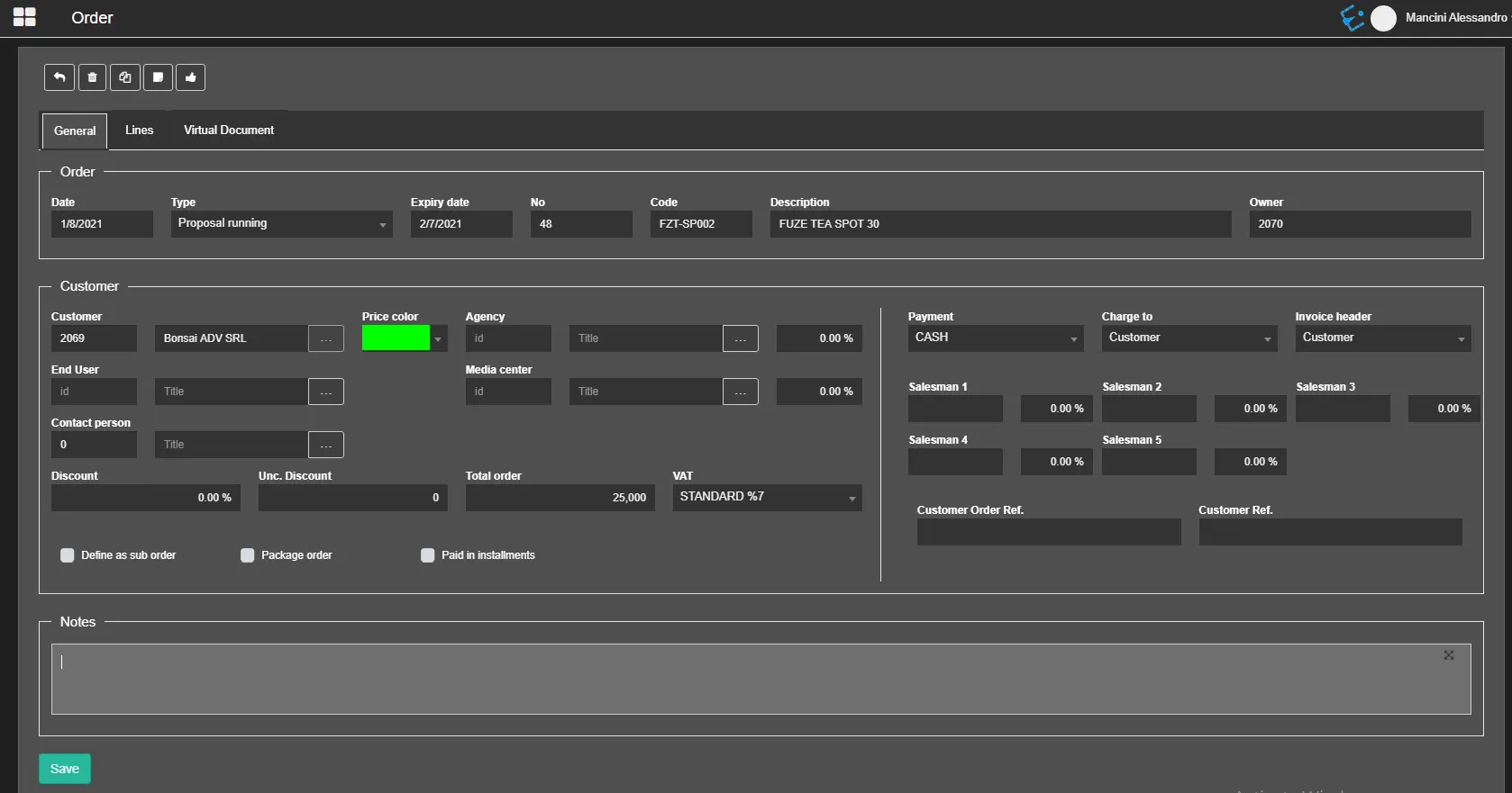 In the Order section, the data coincide with the information you had entered during the creation of the new contract: