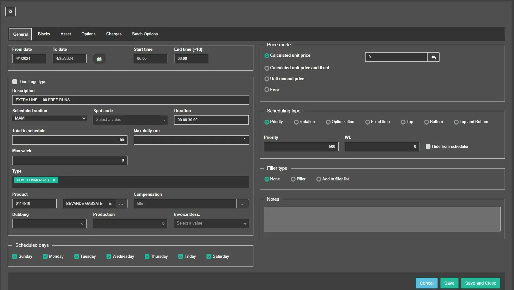 Scheduled days: Select days in a week where the order line is scheduled to go on-air;