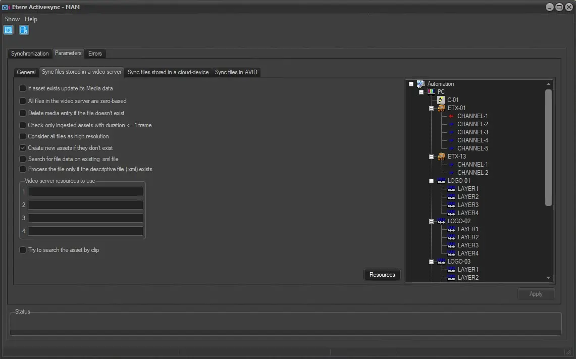 Video Server Resource to use (1,2,3,4): Set the decoder of the video server where files to be synchronised are stored. Press the [Resources] button to drag & drop the channels from the Resource tree to the related text boxes (1/2/3/4).