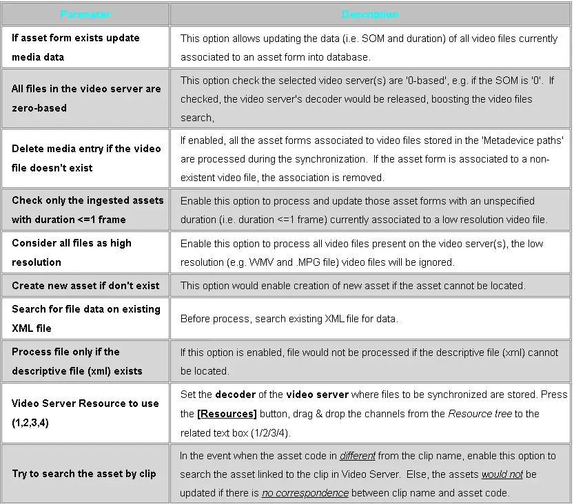 This section allows the configuration of parameters for synchronising high-resolution video files (e.g. mxf, DV, etc.) stored in specific video server(s). It also allows synchronising low-resolution video files (e.g. WMV, mpg, etc.) and subtitles/captions files (e.g. STL, SCC, etc.). The following options are available in this section: