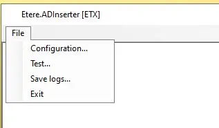 SCTE markers' time and duration are shown in the main form. The file tab contains a menu with the Configuration, a tester, Save logs and Exit buttons