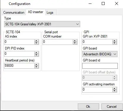 •Ad Inserter: Choose between the currently supported devices (GV XVP 3901, SCTE104 Harmonic and SCTE-35 ML). Each device has a different configuration submenus, and their respective images are shown below