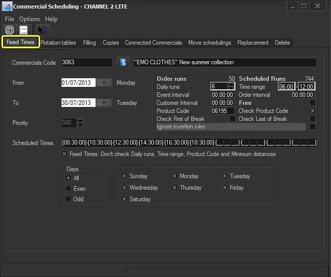 The Fixed Time section allows you to schedule an event in all time ranges the user indicates within a specified period. There is no control for a fixed time, which is also true of commercial crowding. To start scheduling a commercial across fixed times, search for it using the [Commercial Code] button and compile the following parameters: