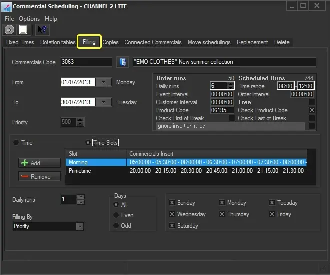 The Filling section allows us to "fill" specific time slots of the programming schedules in a certain period. Unlike the other scheduling methods (i.e. fixed time, rotation tables and copies), the filling method is more complete since it schedules the selected commercial within specific clusters (i.e. time slots of custom durations), thus avoiding unexpected conflicts within schedules as well as paying attention to the commercial crowding.