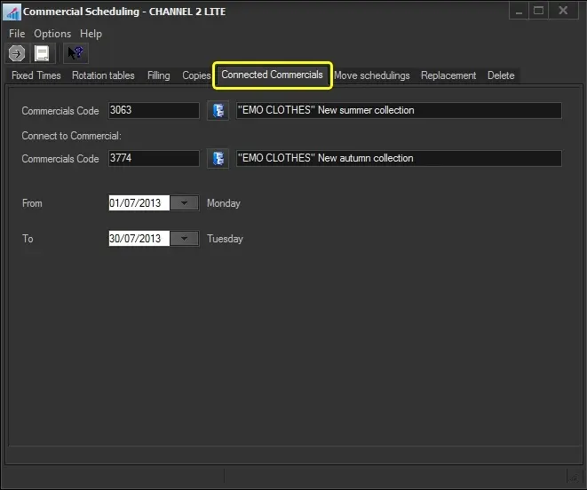 The Connected Commercials function allows connecting a commercial to another commercial already in the schedule. Connected commercials will be inserted on the same date and time as the source commercial.