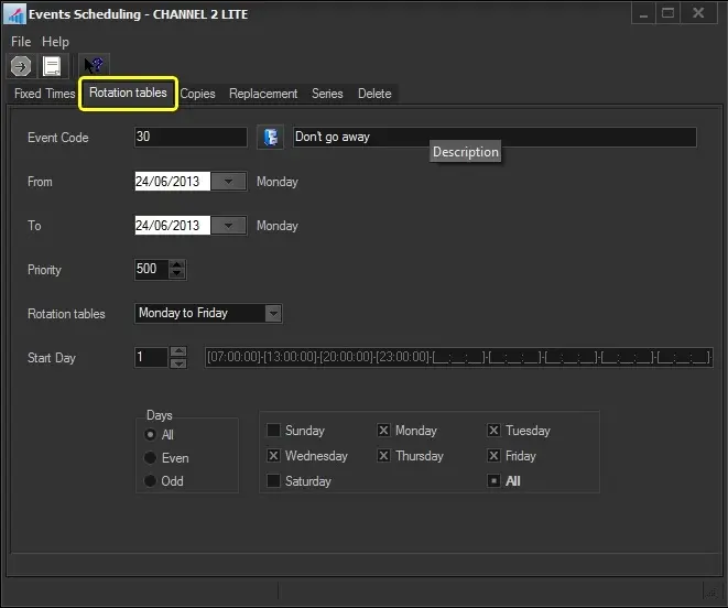Description: Select the days for which the event to be scheduled is valid, in which it will be scheduled: