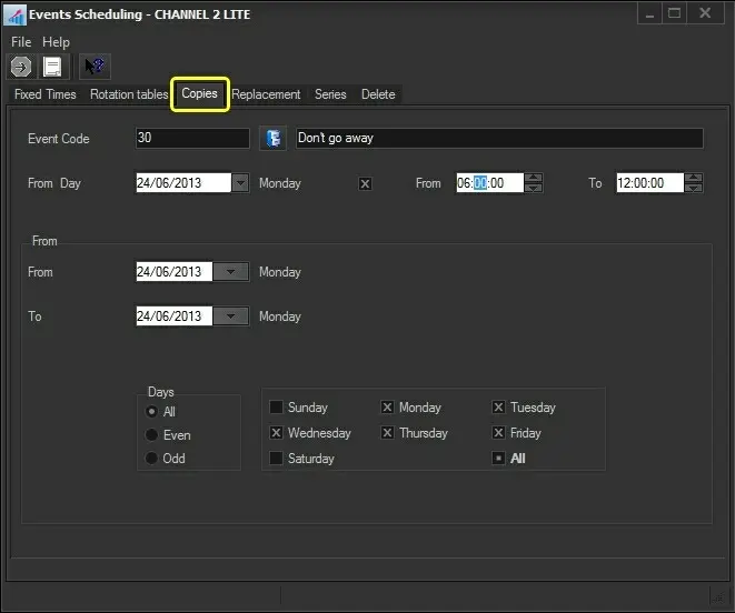 The Copies section allows you to copy a specific asset scheduled on a certain date in a set period to another date. To start copying an event, search for it using the [Event Code] button and then compile the following parameters: