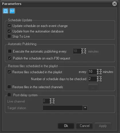 Publish the schedule on each F90 request: If enabled, the programming schedule will be automatically published each time Etere F90 request it (e.g. after an import operation).