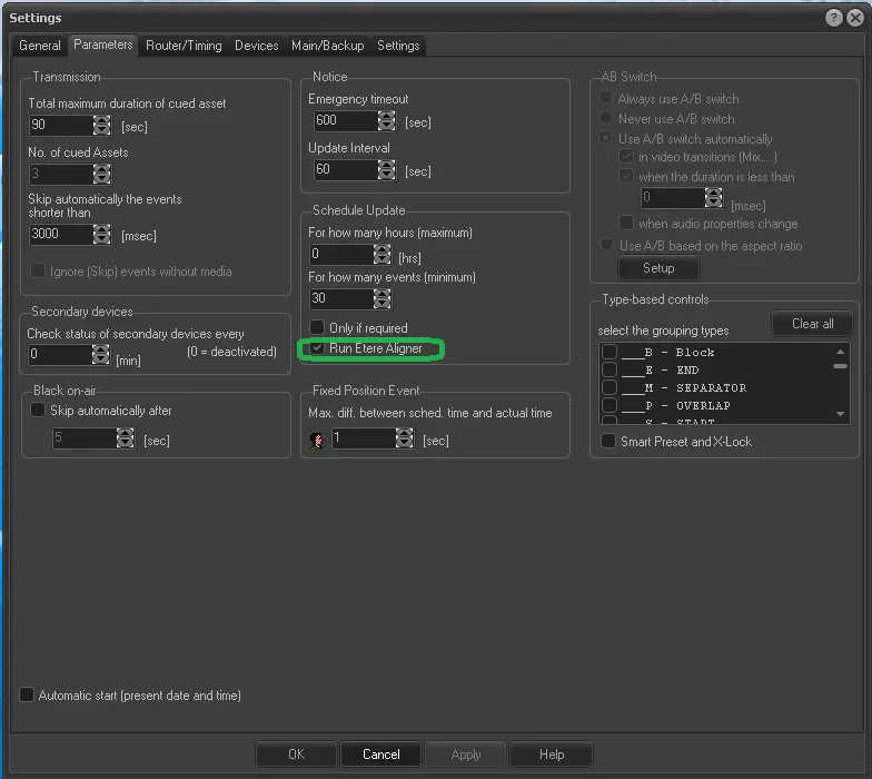 Besides setting the parameters mentioned above, it is essential to set Etere Aligner to start automatically when Etere Automation is launched, so you need to ensure the 'Run Etere Aligner' box is active under Automation | Settings | Parameters:
