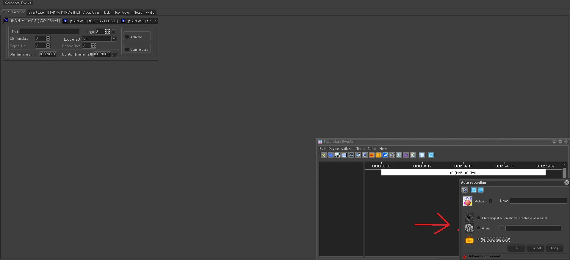 2. Set the event type of the delayed live event as 'timecode'; this is for transmitting it from its mark-in point (SOM) to its mark-out end (EOM);