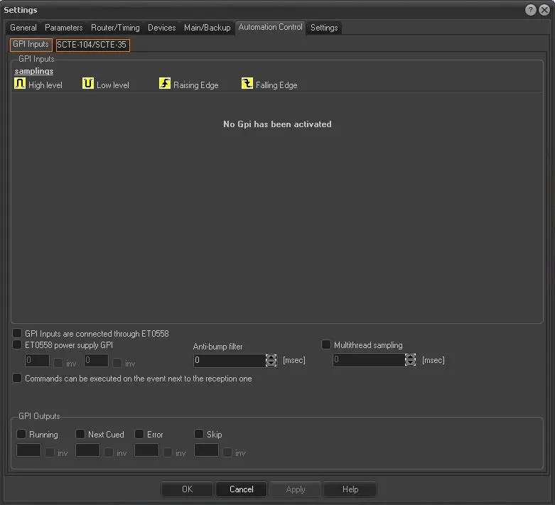 The Automation Controls Tab allows defining the GPI Inputs actions (i.e. execution of automation commands), GPI Outputs actions (i.e. sending of automation status), and SCTE Triggers, to be performed by Etere Automation when specified conditions are verified.