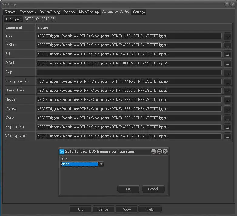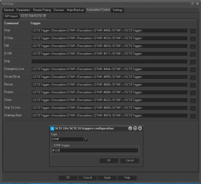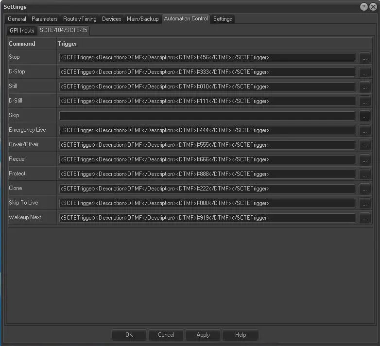 SCTE-104/SCTE-35 triggers to be detected and associated with automation commands such as, for instance, SKIP, SKIP to LIVE, STOP and can be configured in:
