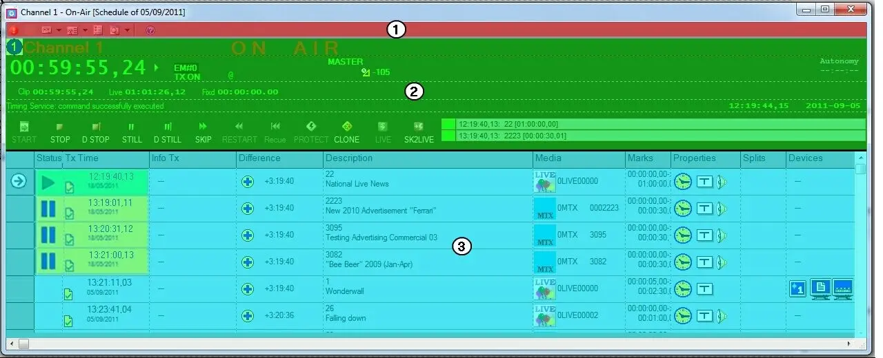 The On-Air window is the main automation interface for managing the playout of the station; it is mainly composed of three areas which will be explained in detail throughout this chapter:onair_user_interface