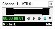 At the bottom panel, the VTR window will indicate the task status (e.g. no task, loaded. Still, cue failed, etc.) and the playback status (e.g. idle, fault, play, etc.) currently in charge of the device.