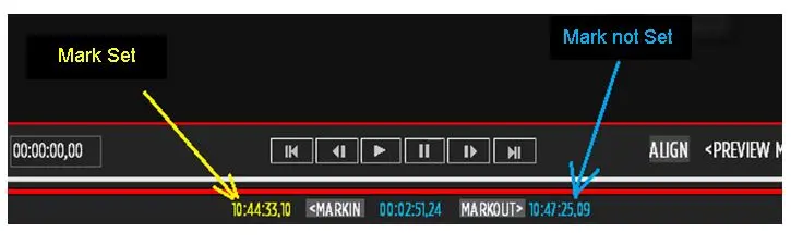 WARNING: To determine if a Mark is set, it must appear in yellow. If it appears in blue, the mark is not set. To set the Mark, select the button [<MARKIN] [MARKOUT>]