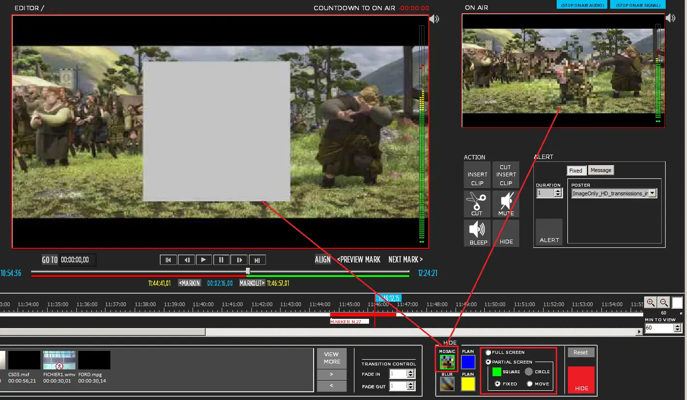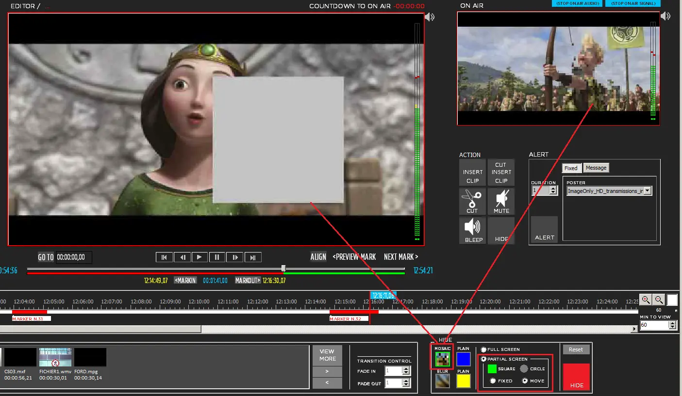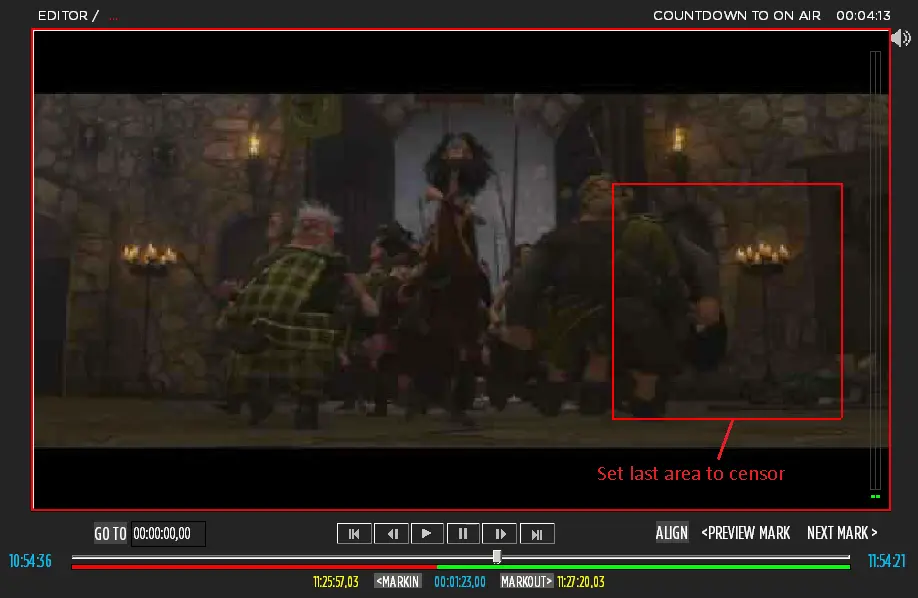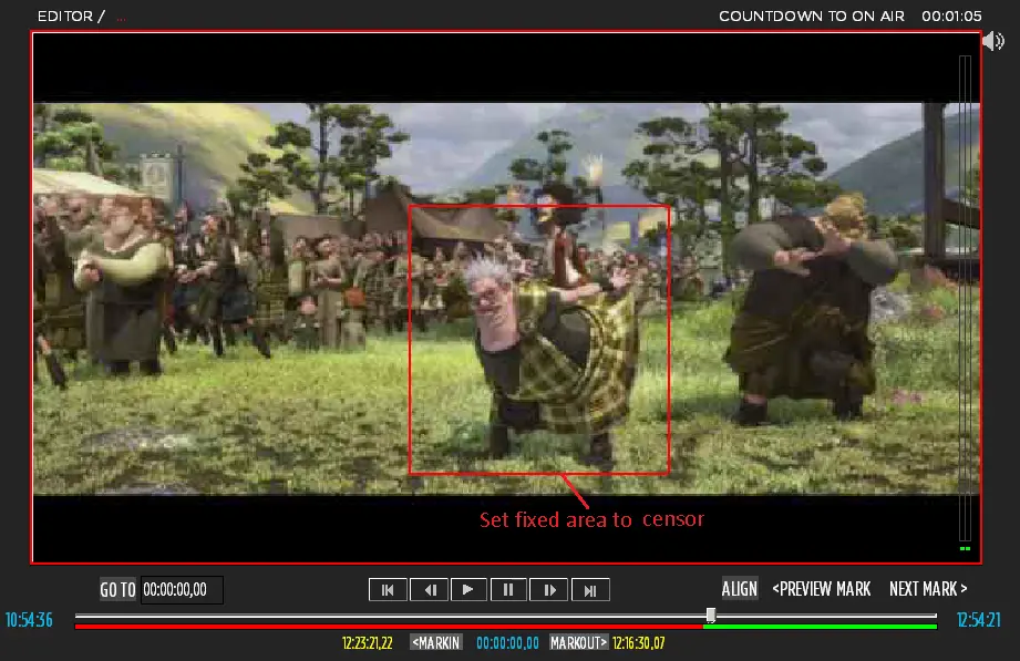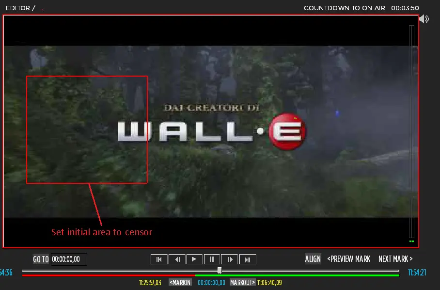 Set on the Editor the MarkOut, and with the mouse left-click, select the coverage area. The area position to cover can differ from the area set on the MarkIn. CensorMX will interpolate the shape positions between the MarkIn and the MarkOut.