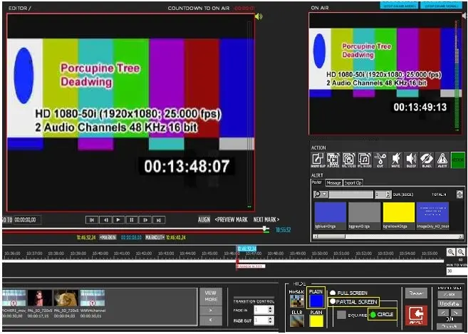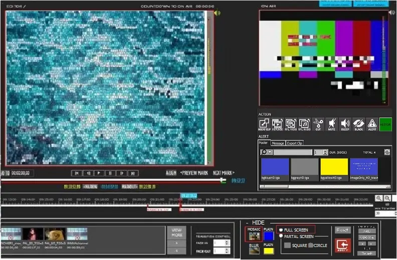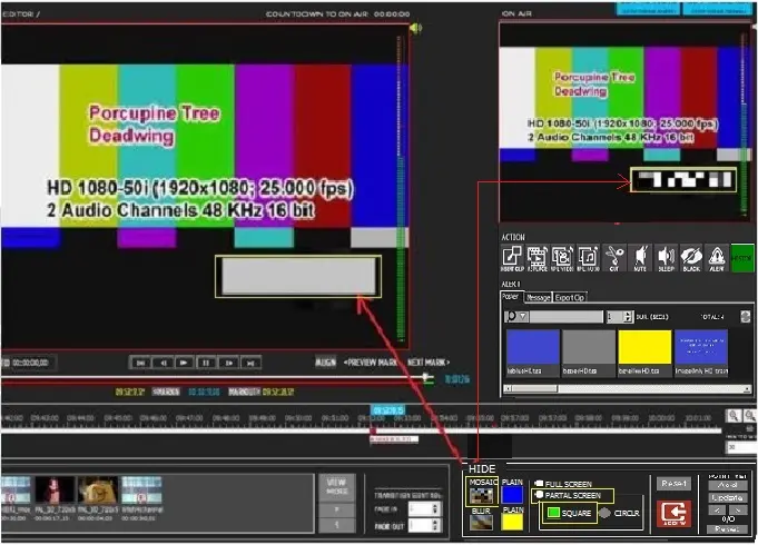 For illustration, in the screenshot below, the partial hide area is displayed in grey in the Editor Display screen on the left; the true effect is displayed on the right when it goes on-air.