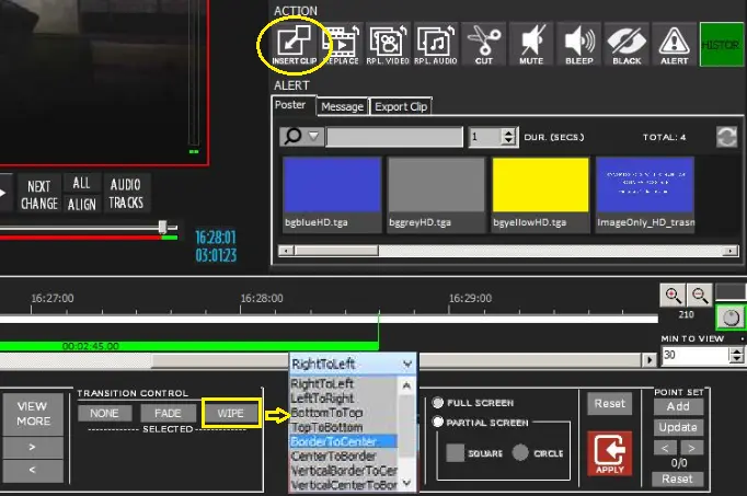In the "Action" section, positioned at the right panel on the interface, the "Insert Clip" function works corresponding with the "Wipe" feature in the "Transition Control" section would enable the user to set a wipe transition in a video file during on-air.