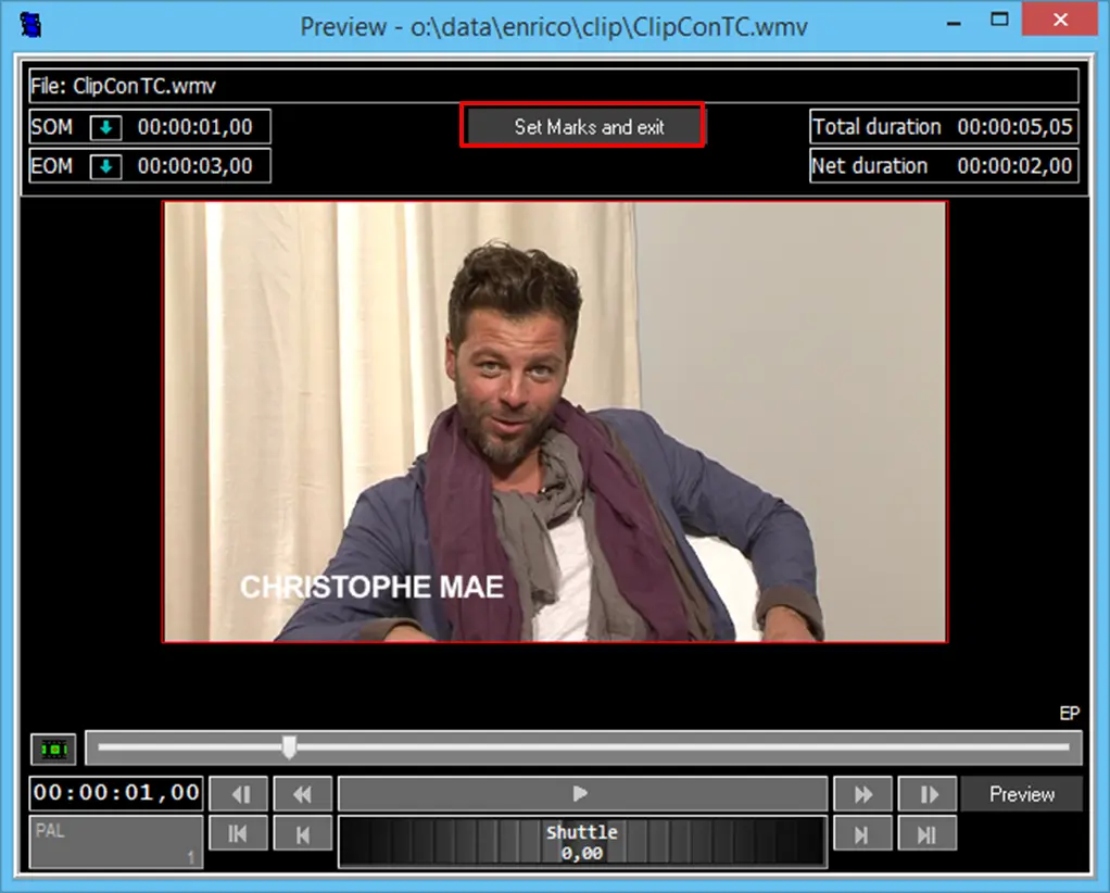 How to set marks The preview form allows you to set the SOM (Start of Mark) and EOM (End of Mark). After setting, select the "Set Marks and exit" button.