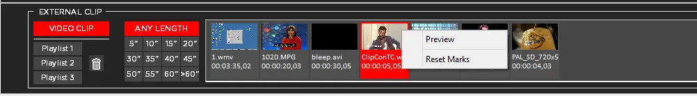 How to preview video In the External Clip window, it is possible to preview a clip and define the marks.