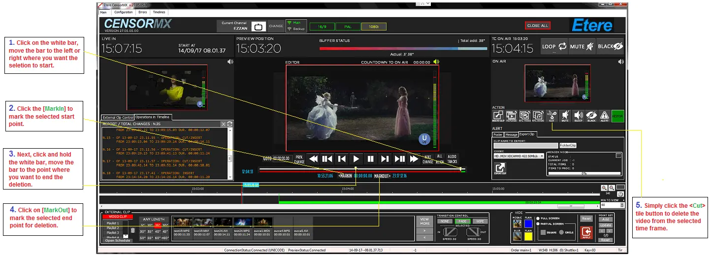 Follow the steps illustrated below to delete (cut) a video file from Editor.