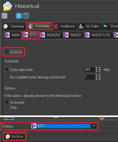 E.g: In the same scenario as the example above, if the user wants to archive schedules for station ETX, he have to browse to tab Schedule, then enable the "Archive" flag and set properly the parameters in ETX tab. Once done, it's enough to go back to Summary tab, select the station in the the droplist and press the [Archive] button.