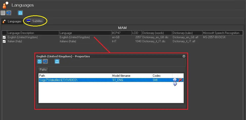 For instance, if you set the model file name as '%1_Italian', when a subtitle is imported into an asset which ID is '10', it will be saved as '10_Italian' within the previously defined path.
