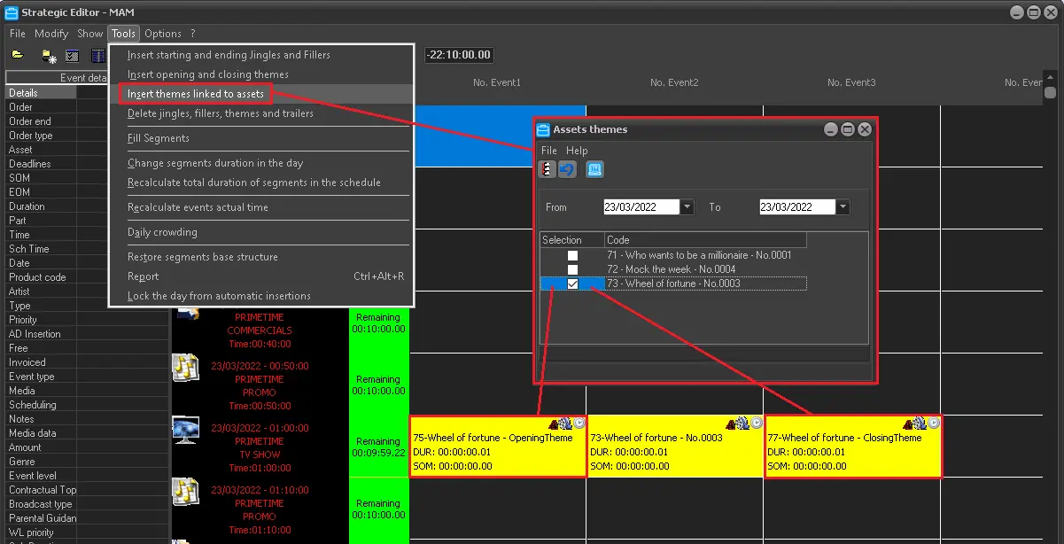 Once assigned, themes can be inserted into the broadcast playlist from the Air Sales > Strategic Editor module through the 'insert themes linked to assets' function:
