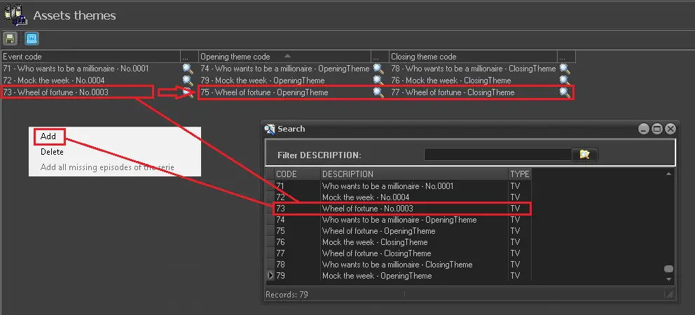 The Asset Themes section allows assigning the themes to a program to be transmitted at the program's opening and closing. This section consists of a list containing the codes of all the assets for which opening and closing themes have been assigned: