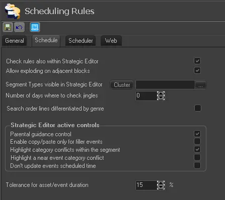 The parameters in regards to the behaviour of commercial schedules (e.g. Strategic Editor):