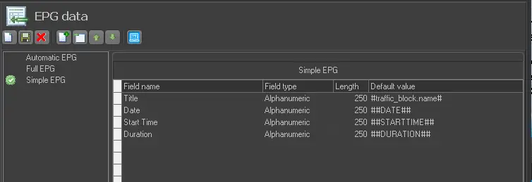 To open an existing EPG schema, double-click on a certain one in the 'EPG Schemes List.' When you open or create a new schema, fields present are automatically loaded on the 'EPG Fields' section, where you are allowed to set the following fields: