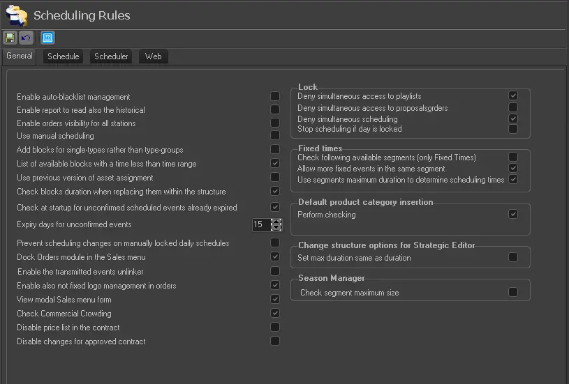Prevent scheduling changes on manually locked daily schedules - If enabled, the deletion of locked events (proposal lines) from commercial playlists (from Strategic Editor) is not allowed.