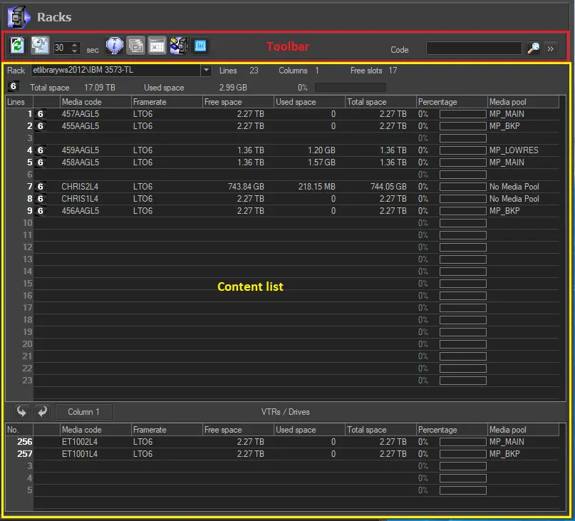 As shown in the figure above, the Rack's interface is mainly divided into the Content List (where contents of each library/cart can be consulted) and the Toolbar (which provides supported management functions).