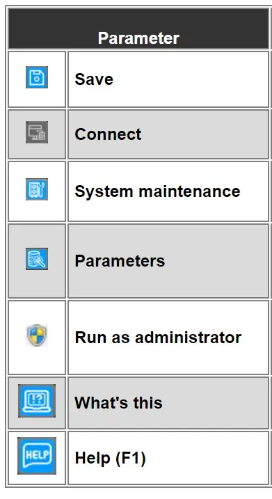 What's this: This icon allows you to use contextual help. Click on this icon and move the pointer to the parameter to display a brief description.