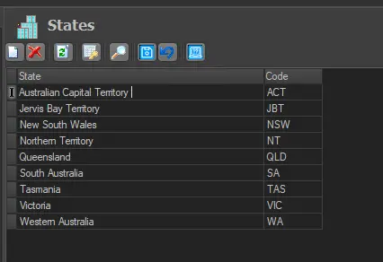 The "States" table contains a list of all the states within the country currently selected in the "basic > system" settings; for each state, the related abbreviated code is listed: