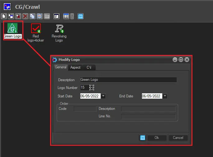 A CG/Crawl represents a layer of a logo-insertion device (e.g. MTX Logo) used to overlaid objects (e.g. MTX text objects) over transmitted programs. Devices layers related to CG/crawls are configured in the Configuration > Resources module.