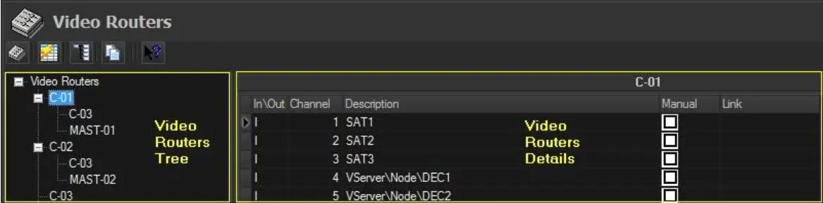 This section is mainly divided into two areas: the Video Routers Tree (showing all configured routing devices) and the Video Router Details, which allows renaming and linking routing channels through the following fields: