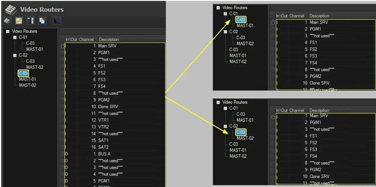 For example, if a television station uses one master control (e.g. MC1) which inputs are connected to a two video routers (e.g. C1 and C2) for redundancy, a virtual router allows to concurrently switch signals coming from the main router to the master controls, if one master control fails the other master control could take over.