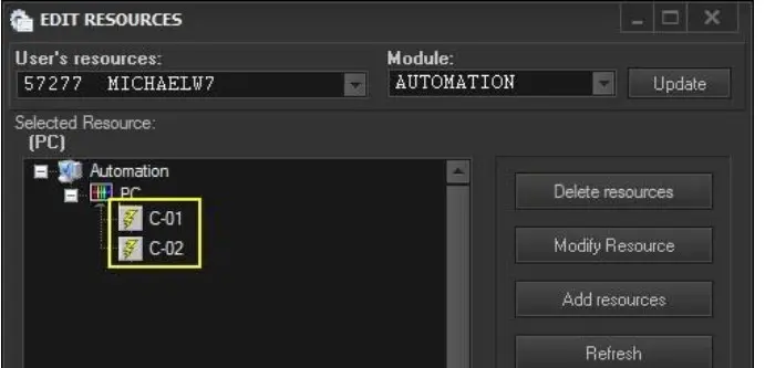 4. Assign the virtual router and its linked routers (e.g. Quartz and MTX MC) to the automation by selecting each resource, pressing the [Users] button and adding the "automation" or "automation clone" users(s):