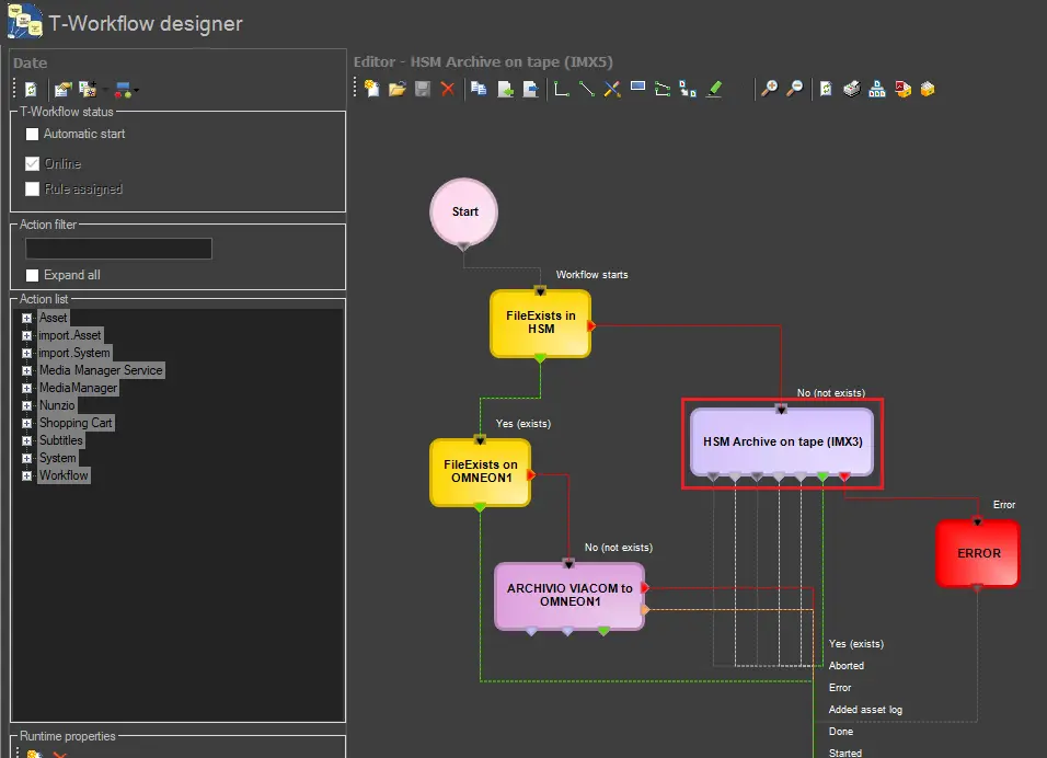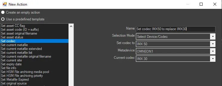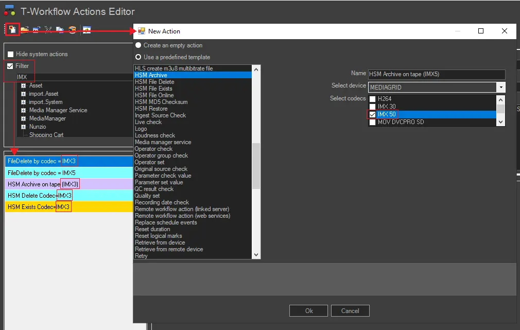 ii. Based on "old" T-workflow actions, Create all the required T-workflow actions for the new codec (e.g. "HSM Archive IMX50", "HSM Restore IMX50", "File Exist in HSM Codec=IMX50", etc).