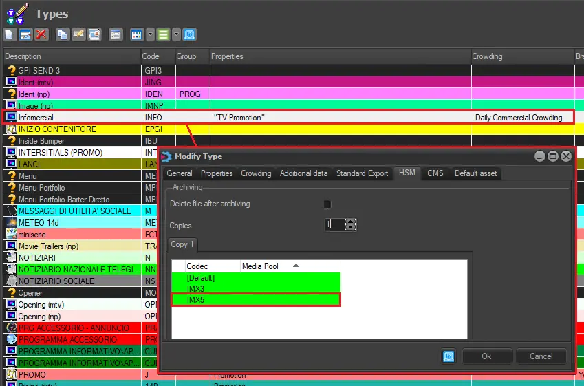 Under the "Etere Configuration > Settings > Types editor > Types > HSM" section, add the new codec (e.g. IMX50) for all the types and link it to an appropriate media pool: