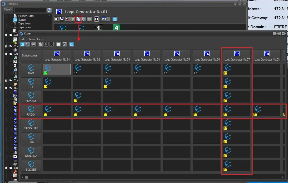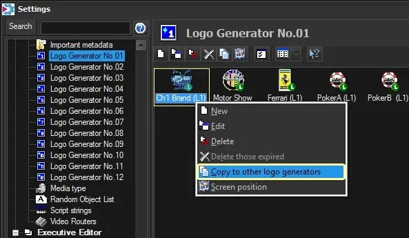 The "Copy to other Logo Generators" contextual function allows copying an existing logo (including all its properties) from one logo generator to another and from one station to another. Logos with the same number are not allowed to exist in the same station and logo generator.