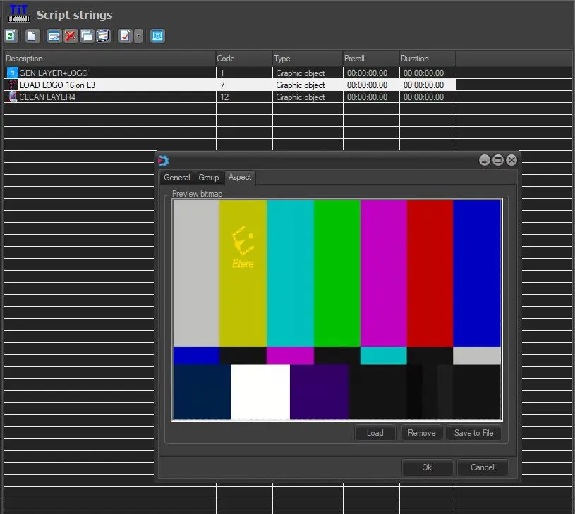 A script string named "Preview bitmap" is created and assigned to the "Fixed logo" generator and "CG/Crawl" logo generator for performing a preview with the logo on the following objects: